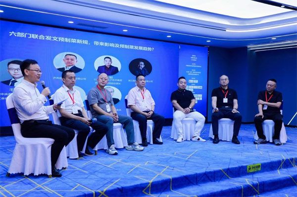 高端对话环节,在众联中央厨房研究院副院长兼中餐工业化(预制菜)研发中心主任毛文星的主持下,济南超意兴餐饮有限公司副总经理任重远、山东企叮咚电子技术集团有限公司导师团总团长王潇毅、浙江能通碳科技有限公司联合创始人李广彤 、湖北百家放心鲜食食品有限公司董事长黄健、吉林省源泽农业科技发展有限公司总经理李尚泽、汶桥(济宁)供应链管理有限公司总经理肖丙振围绕“六部门联合发文预制菜新规,带来影响及预制菜发展趋势?”话题进行了精彩的内容分享。